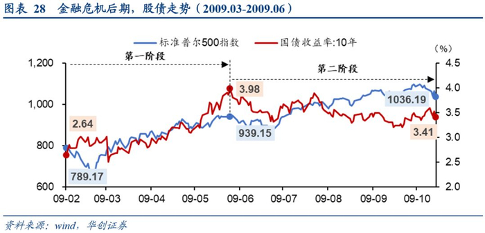 第三阶段(2009.03-2009.06):危机进入后半场,随着QE扩容等更大规模的额刺激政策出台,基本面逐渐触底,经济出现复苏迹象,股市触底回升,开启十年牛市;美债收益率则大幅上行。