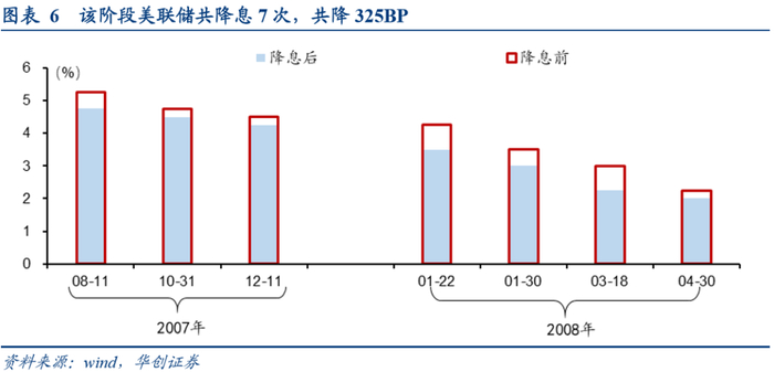 2007年底美联储货币政策转为宽松,加大流动性投放力度,努力缓解危机所引发的信贷紧缩风险。8月初法国巴黎银行和贝尔斯登事件爆发后,美联储迅速发表声明,宣布将向金融系统提供尽可能多的资金以缓解信贷紧缩蔓延的不利影响,美联储的降息操作打响了宏观政策调控的第一枪;在此阶段,美联储共7次下调联邦基准利率225BP,降至2%的历史低位。本轮降息操作具备“快速”与“强烈”两个特点,首次降息发生在2007年8月11日,即事件发生后的第三个工作日;随后,伴随着信贷问题的日益严重,政策将目光聚焦于银行等大型金融机构,通过再贴现和定向提供贷款等方式为市场注入新的流动性;此外,美国房地产抵押巨头房利美与房地美在次危机中岌岌可危,为提振市场信心,维护信贷市场稳定,联邦政府最终决定出资将其收购。