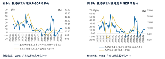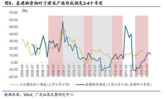 基建的施工周期大约滞后于融资周期3-4个季度。基建项目从立项、融资、审批到开始施工建设需要一个过程,从基建融资到形成建筑收入和产值(也就是创造GDP),大约需要3-4个季度,且随着基建周期的轮回演变,这一时滞在逐渐拉长。