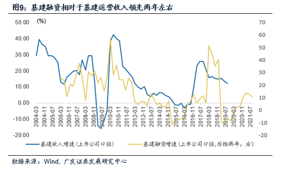 基建的运营周期大约滞后于融资周期两年左右。从项目融资到施工需要时间,到项目运营需要的时间则更久。根据上市公司数据来看,基建收入和产值大约滞后于基建融资两年左右。