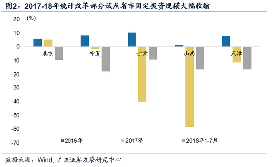 2017年,统计局发布了《关于开展2017年固定资产投资统计制度方法改革试点工作的通知》,在山西、河北、甘肃等20个省市开展投资统计改革试点工作,以财务支出法逐步取代形象进度法。这本质上是一个统计数据挤水分的过程,部分统计改革试点省市的固定资产投资规模也在这段时间出现大幅收缩。2018-19年,投资统计改革再度加快。