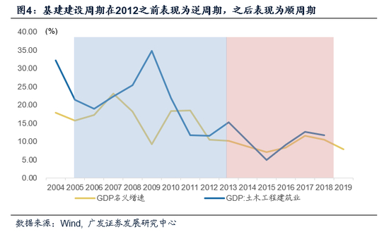 2012年之前,基建建设周期表现出明显的逆经济周期特征,而2013之后则更多地表现为顺周期。我们常说基建是逆周期调控的重要工具,指的是在政策层面,基建政策往往在经济下行期发力;但从政策出台到相关行业的产值创造需要一个过程,如项目立项与审批、招标设计、建设施工、竣工与运营等一系列相对复杂的步骤,因此政策的逆周期并不一定意味着基建建设本身的逆周期。2012年之前,基建建设周期表现出明显的逆经济周期特征,而2013之后则更多地表现为顺周期。