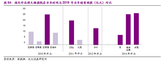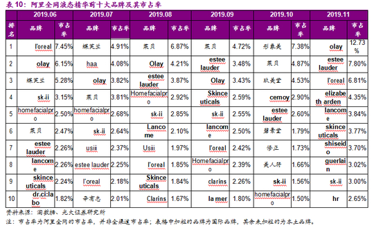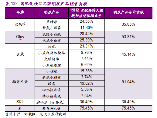 据淘数据,2019 年下半年定位较本土品牌更高的 Olay、兰蔻、雅诗兰黛、后等国际品牌明星产品销售额贡献超 50%,背后的支撑为这些明星产品较强的产品力及产品口碑。