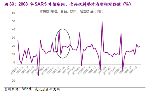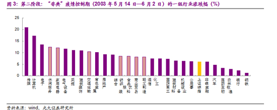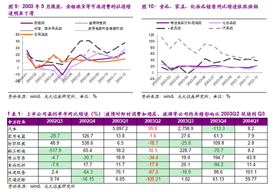 从细分行业看,消费中一些行业基本面恢复较快的行业,在“非典”疫情后期和疫情结束之后的一个季度表现更好。景气度较高的轻工、纺织制造具有超额收益,而业绩受损较大,且未体现明显好转的即时消费行业,大多转而下跌。从社零增速来看,2003 年全社会消费品零售总额同比增速自 3 月 9.3%明显回落,并在 5 月份加速回落至 4.3%,下降幅度较大的行业主要是服装、金银珠宝,食品等必须消费品以及家具、汽车、体育用品增速几乎未受影响或很快反弹。