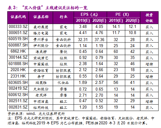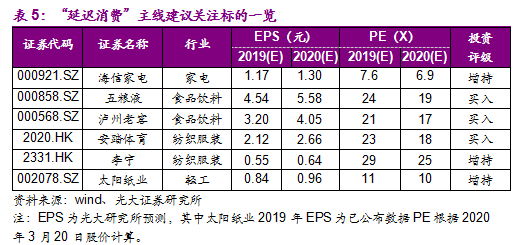 注:EPS 为光大研究所预测,其中宋城演艺、中国国旅、安踏体育、天虹股份、老凤祥、中顺洁柔、裕同科技 2019 年 EPS 为已公布数据,PE 根据 2020 年 3 月 20 日股价计算。
