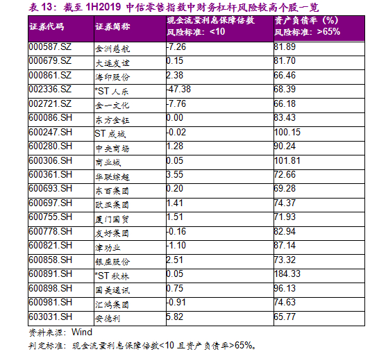 我们在表 13 罗列了截至 1H2019 中信零售指数中财务杠杆风险较高个股,并认为中小型高财务杠杆公司在疫情情况下,机会和威胁并存。一方面较高财务杠杆在目前情况下经营业绩恶化,但另一方面或推动部分公司整合采取收购兼并等方式进行行业整合。