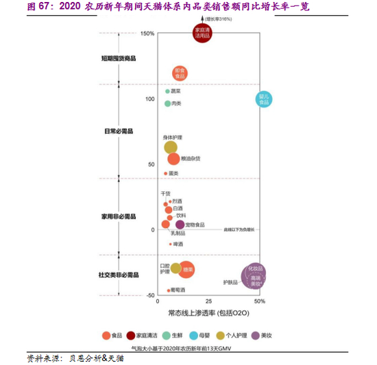 从品类角度看,根据贝恩和天猫在春节期间对天猫口径各品类的统计, 必需品包括粮油食品、日用品以及婴儿食品维持了较好的增长势头,这与疫情及节日影响下其吸收线下需求不无关系。而酒类、化妆品类等典型可选品因社交需求锐减等原因表现不佳。