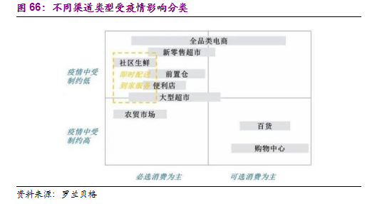 从渠道角度看,线下业务占比较高,且经营品类以可选品为主的企业短期受疫情负面影响的程度更高,如以渠道分类,受影响较大的是百货及购物中心。而销售品类以必选品为主的超市类业态受冲击相对较小。