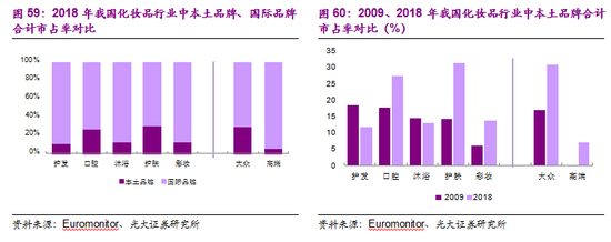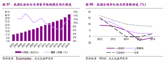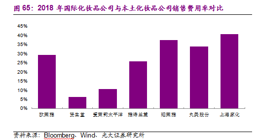 而对于大众品牌,因其产品力差异性不大,销售额的保障需要更多的营销及渠道拓展,因而大众竞争主要集中于营销>渠道>产品。2018 年我国化妆品上市公司平均销售费用率为 37.37%、显著高于同期的国际化妆品公司销售费用率 17.98%。渠道拓展方面,对于成长性较高的电商渠道,我国化妆品品牌(定位通常低于国际大牌)响应速度更快、进入电商渠道时间更早、率先抢占了一定的先机。