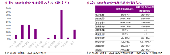 其次,若海外需求整体下滑 10%,利润影响幅度为低个位数,幅度可控。我们考察板块重点公司数据。以 2018 年数据为例,海外业务收入占比相对较高的包括:美的(42%)、海尔(42%)、海信(30%)、新宝(85%)、苏泊尔(27%)。但从推算的利润占比看,较收入占比更低。比如:美的出口业务利润占比为 20%~25%,而海尔为 25%~30%。即使在龙头整体出口
