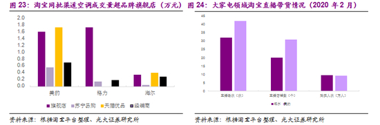 除了单纯的增加线上渠道的投放力度外,疫情的影响更是进一步倒逼传统线下渠道与线上渠道的融合。天猫优品(网批)继续快速放量,2020 年以来,空调成交量已经比肩甚至超越品牌旗舰店。而为了改善线下的动销, 美的、海尔也在淡化渠道间的 SKU 区隔,鼓励支持线下经销商在线上的直播带货等新的模式(2 月直播销售规模均达 3 亿元左右)。