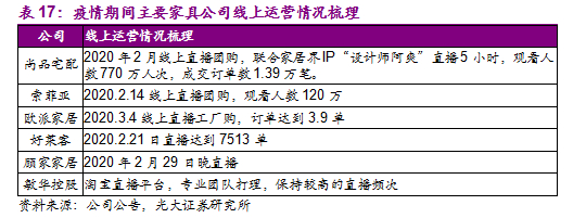 疫情影响下,家具公司纷纷加大线上营销与引流力度。其中具有丰富互联网经验的公司尚品宅配通过携手 KOL 设计师阿爽直播 5 小时,实现成交订单 1.39 万笔,预计销售额超过 4 亿元。同时,家具公司还辅以 VR 全景帮助消费者体验家居装修 3D 全景。