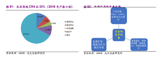 生活纸企:2018 年中国生活纸企的 CR4(金红叶、恒安、维达、中顺洁柔)占比合计约 33%(产能口径),相较国外(CR4 基本在 60%以上) 集中度仍有较大提升空间。未来在渠道和产品端有竞争优势的企业将享受行业集中度提升的红利。中顺洁柔作为生活用纸的龙头企业,2014 年新任管理层到岗,其中各大区销售总监均有生活用纸行业背景。公司在区域划分、销售结构、考核机制方面都有调整,改革后实现了稳健快速增长。同时公司实现了产品的升级和品类的拓展,有利于抢占高端市场,提升客户粘性。从而进一步扩大市场份额。