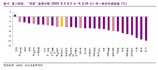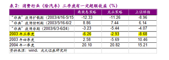 (4) 在随后股指一路下跌的 2003 年三季度,市场一方面在消化 8 月提高准备金率带来的流动性冲击,一方面逐步寻找经济增长见底反弹的信号。板块的运行逻辑逐步脱离了疫情冲击的主导,这一期间消费板块整体表现相对上证综指虽没有明显超额收益,但已明显好于整个疫情期(2003 年 4 月16 日—6 月 24 日)。
