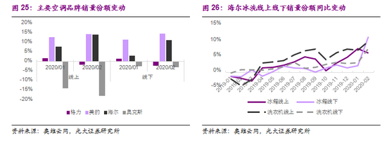 份额龙头强者恒强,韧性更强。从空调份额看,促销力度更大,对新渠道反应更快的美的 1~2 月线上线下份额继续保持强势增长,同比提升 10pct 以上,而海尔在快速跟进后份额亦有体现。在冰洗领域,海尔优势明显,2020 年 1~2 月,份额提升幅度有进一步提升的趋势。而凭借零售端份额的提升,短期龙头收入利润将表现出超越行业的韧性。