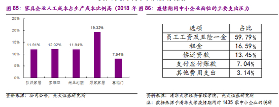 家具行业产业链上下游大多都是劳动密集型产业,家具行业人工占成本结构比例也较高,存在一定影响。物流配送短期也受到一定影响。其中定制家具由于按订单生产,短期压力较大。