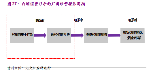 龙头企业的经销商缓冲器效应更加明显:1)对于白酒企业而言,名酒 的经销商蓄水能力更强:由于名酒基本上都采取先款后货的打款方式,因此 经销商的打款承接能力及蓄水能力至关重要。同时由于白酒的生产工艺特点, 白酒不仅没有保质期的限制,以酱香型白酒为代表、其储藏时间越长往往越 具有升值的空间,名酒的经销商通常也会有蓄水的意愿。不同价格带白酒的 经销商的蓄水能力也有很大差异,通过高端白酒的经销商资金实力最强,次 高端白酒和中高端白酒次之。