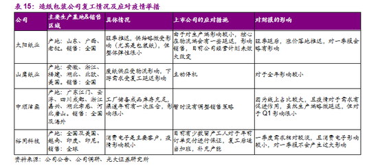 造纸包装短期之内受工厂开工推迟和物流影响,业绩会受到一点压力, 预计 Q1 的业绩增速不乐观,但长期来讲,龙头公司具备整合实力,通过产能扩张、渠道开拓、客户外延等方式逐步抢占市场份额,实现行业集中度的进一步提升,所以具备长期增长的逻辑。对于文化纸而言,由于下游的需求跟开学密切相关,如今开学时间推迟,但需求仍在,只是短期之内需求出现下滑,导致 1 季度业绩承压,但二季度由于推迟消费影响,增速上调预期, 因此全年影响很小。