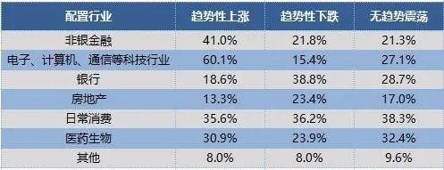 下表为:专业机构投资者在不同市场预期下重点配置的行业占比明细表