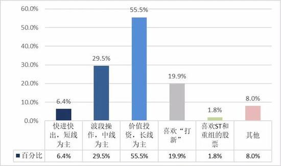与之相比,有55%的受调查一般机构投资者倾向于价值投资,以长线操作为主,选择波段操作、以中线为主和喜欢“打新”的占比分别为29.5%和19.9%。