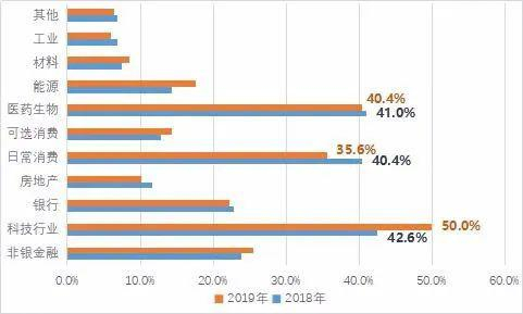 而在2019年,半数受调查的专业机构者重点配置了电子、计算机、通信等科技行业。