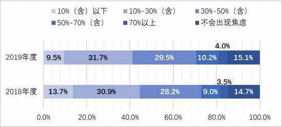 与此同时,自然人投资者能承受的股票亏损比例也有所提升,六成自然人投资者在股票亏损10%-50%时会出现焦虑。