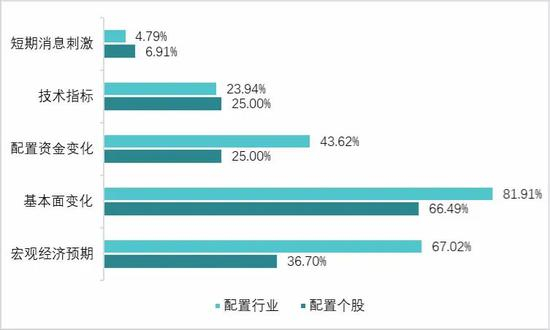 专业机构投资者在选取配置行业和个股时,基本面变化是其参考的首要因素,宏观经济预期是次要因素;此外,在配置行业时还会参考行业配置资金变化;在配置行业和个股时对于技术指标的关注度一般,考虑短期消息刺激占比较低,具体如下: