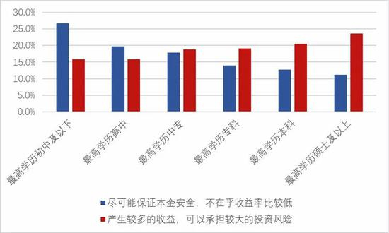 调查还显示,自然人投资者的学历与风险偏好呈现明显的线性关系,投资者学历越高,风险偏好程度越高。