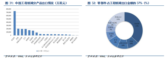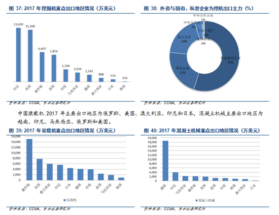 分产品来看,2017 年中国工程机械出口有 37为零部件,出口比较多的整机主要有电梯及扶梯(10)、叉车(9)、装载机(8)、挖掘机(7)和混凝土机械(4)。