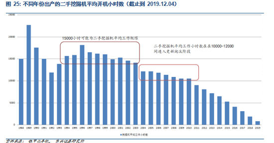 结合我们在 8 月份所做的《挖掘机深度报告:从增量驱动到存量为王,更换高峰或 2020 年到来》,我们认为以 11000 个小时作为二手挖掘机更新淘汰的界限是符合两次样本数据的结论。