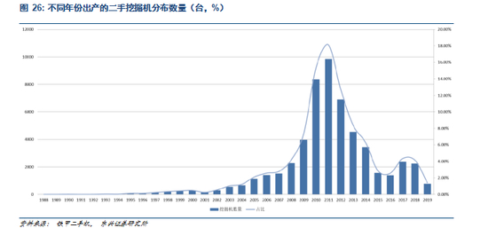 上轮挖掘机行业销量峰值出现在 2011 年,也是存量二手挖掘机份额最高的年份。根据样本数据,2011 年出产的挖掘机占目前二手机比重为18.12,2010 年和2012 年出产的挖机占比分别为15.38和12.70,与上轮周期年度销量节奏基本一致。
