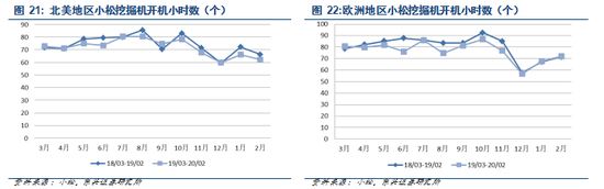 从挖掘机使用节奏来看,中国地区春节后(一般为 3-5 月份)和 8-10 月份为开机旺季,春节期间挖掘机销量和开机小时数均有较大回落。北美和欧洲地区 12 月至次年 2 月为开工淡季,开工旺季一般集中在 8-10 月份。