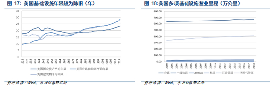 目前美国多项基础设施陈旧严重,公路、一级铁路、Amtrak(美国国铁)等多年来营业里程增速缓慢, 根据美国经济分析局的数据,目前美国公路和接到平均年限达到 28.9 年,固定资产平均年限达到 23.4 年,均为历史最高,且不断攀升。