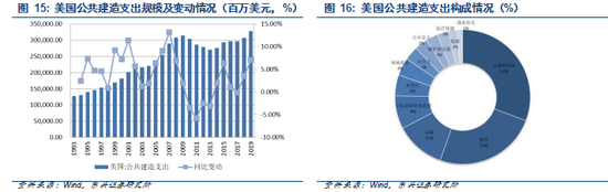 美国近年来公共建造支出总体保持平稳,2019 年支出规模为 3286.69 亿美元,其中用于公路与街道、教育、运输、下水道和垃圾处理占比分别为 31、25、12和 8。