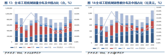 目前全球工程机械需求主要由中国、北美和西欧带动,根据 2018 年的数据,以销售额统计分别占据全球需求的 23.01、30.88和 13.31,以台数统计分别占全球需求的 26.38、17.31、15.73。
