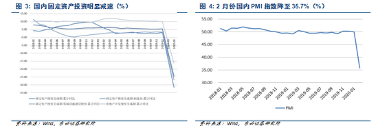 但不可否认,严格的隔离措施对于经济有较大的负面影响,2 月份国内多项经济指标降幅明显。1-2 月全国固定资产投资(不含农户)33323 亿元,同比下降 24.5;其中,制造业投资下降 31.5;基础设施投资(不含电力、热力、燃气及水生产和供应业)同比下降 30.3,房地产开发投资下滑 16.30。2 月份国内 PMI 指数为 35.7。