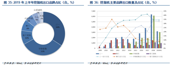 截止 2019 年 H1,挖掘机出口数量位于行业前列的品牌分别有三一重工(占比 34)、卡特彼勒(占比 33)、徐工挖机(占比 10)和柳工(占比 8)。近十年来,以三一重工为代表的自主品牌在挖掘机出口中迅速崛起,成为国内挖掘机出口的主力。2009 年三一重工在挖掘机出口中占比仅为 3.29%,目前已经占据三分之一的份额。