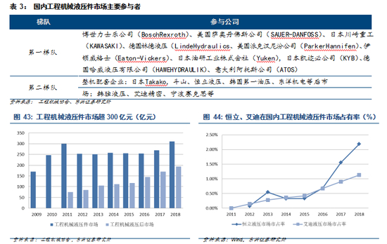 根据工程机械协会的数据估算,2018 年国内工程机械液压件市场空间已经超过 300 亿元,其中超过 190 亿为后市场相关。目前博世力士乐、丹佛斯、川崎重工、林德液压、派克汉尼汾等外资企业仍占据液压市场的主力份额,恒立液压、艾迪精密近年在液压油缸、马达、泵阀市场快速崛起、但整体市占率仍处于较低水平。