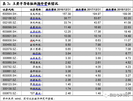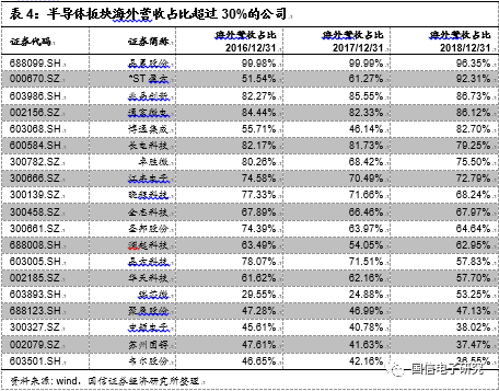 在50家半导体公司中,约19家海外营收占比超30%,约15家海外营收占比超过50%。其中如封测环节例如长电科技、通富微电、华天科技等公司2018年海外营收占比均较高。