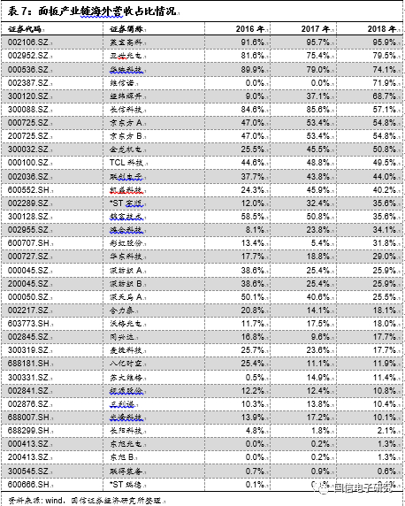 我们统计了三年来面板产业链的海外营收占比情况,从下表可以看出面板制造及模组等中下游环节由于其下游客户多为海外公司,因此普遍海外营收占比较大。代表公司:长信科技、京东方A、TCL科技等。