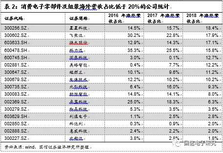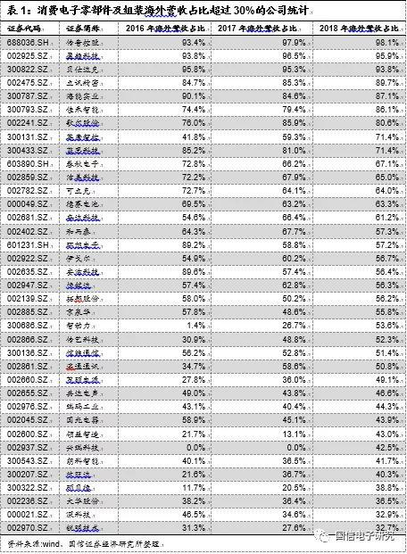 我们将主要消费电子公司近三年来海外营收占比较大的公司进行统计,得出下表。