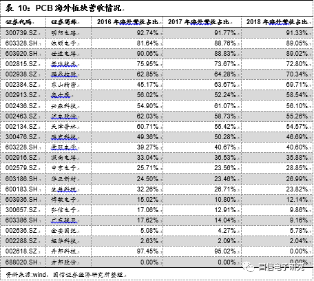 整体来看,2018年PCB板块上市公司海外收入整体占比水平较高,达到52.8%。其中海外收入占比较高的公司分别为:明阳电路、崇达技术、鹏鼎控股,其海外收入占比均超过70%以上。海外收入占比较低的公司分别为:方邦股份、超华科技、广东骏亚,其海外收入占比均在10%以下。