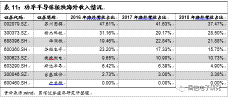 整体来看,2018年功率半导体板块上市公司海外收入整体占比水平适中,达到18.2%;其中,海外收入占比最高的三家公司分别为:扬杰科技,华润微,其海外收入占比均超过20%以上,整体来说比例并不高。海外收入占比最低的三家公司分别为:士兰微,台基股份,斯达半导,其海外收入占比均在10%以下。