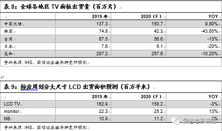 从下游面板的需求来看,70%的需求面积来自TV,而中国占据全球TV销量的25%,其次为北美、亚太、西欧、拉美等地区。受到疫情影响,IHS预计2020年,液晶电视面板出货量预计将下降10%,液晶电视面积出货量将下降3%。这是史上第一次出现出货面积下降。我们预计对全年供需造成的影响可能导致面板价格涨幅走弱甚至下滑,但从长周期角度来看,整体供给端的拐点已经到来,需求的短期大幅波动并不影响中国面板厂竞争力持续提升。