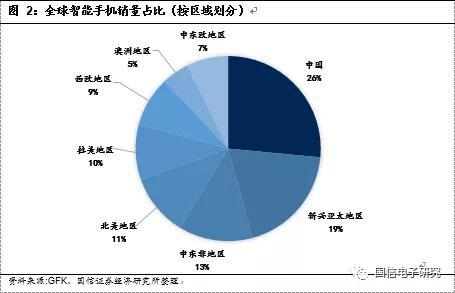 根据GFK数据,全球智能机市场,中东非地区、新兴亚太地区、中东欧地区销量同比持续增加,2019年,中国智能手机销量占全球市场份额的26%。