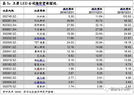 LED下游海外营收占比大,LED上游海外占比相对较小