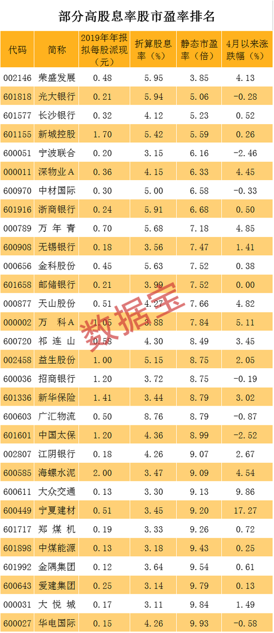 在股息率超过3%的个股中,广汇物流、荣盛发展、光大银行等30只个股去年净利增长超过10%且静态市盈率低于10倍。其中,荣盛发展市盈率最低,不到4倍,光大银行、长沙银行、新城控股等个股市盈率不到6倍,宁波联合、深物业A、中材国际等个股市盈率均不足7倍。