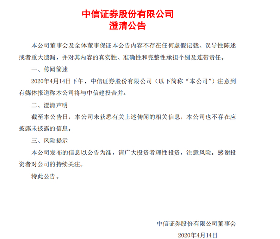 晚间,中信证券发布澄清公告,2020年4月14日下午,中信证券股份有限公司(以下简称“本公司”)注意到有媒体报道称本公司将与中信建投合并。截至本公告日,本公司未获悉有关上述传闻的相关信息,本公司也不存在应披露未披露的信息。