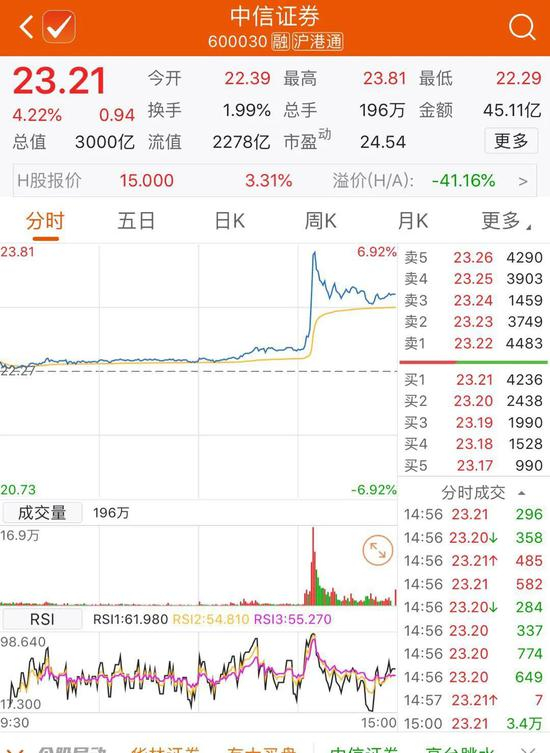 消息一出,中信证券和中信建投股价出现直线跳涨。截至收盘,中信证券上涨4.22%,收报23.21元/股;中信建投上涨8.88%,收报32.85元/股。