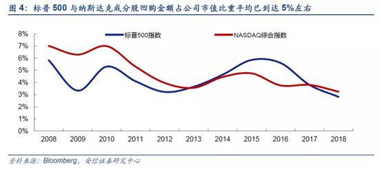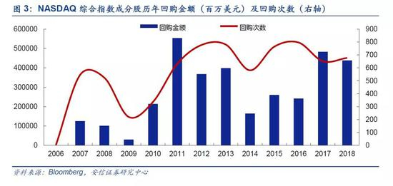 特别是金融危机以来,美股回购规模巨大,且增长迅速。2007年以来,纳斯达克成分股共进行了7284次股票回购,回购金额达3.4万亿美元,仅2017年就回购了4832亿美元。根据今年美股的回购进度,我们预计2018年美股回购总金额将超过万亿美元。